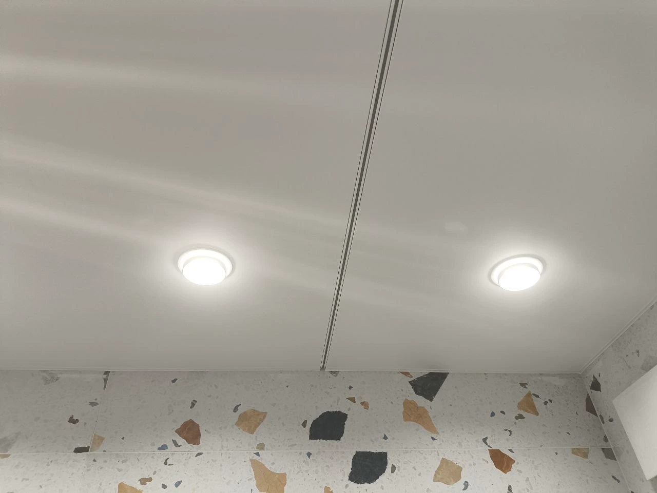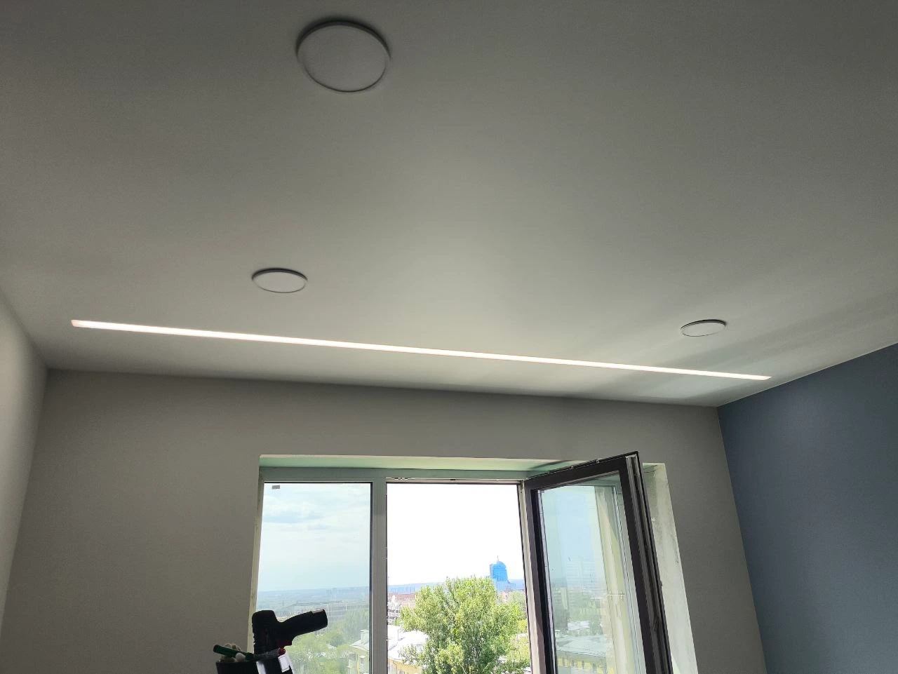 Монтировали белые матовые потолки с обычным стендовым профилем со вставкой. В качестве основного света клиентом были выбраны точечные светильники и световые линии. В гостиной был смонтирован скрытый карниз пк14. В санузле в качестве направляющей для шторы ванной был выбран карниз flexy shtorka. Общая стоимость проекта составила 115000 рублей.