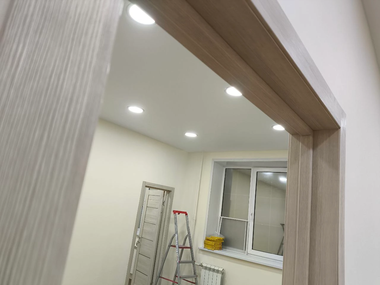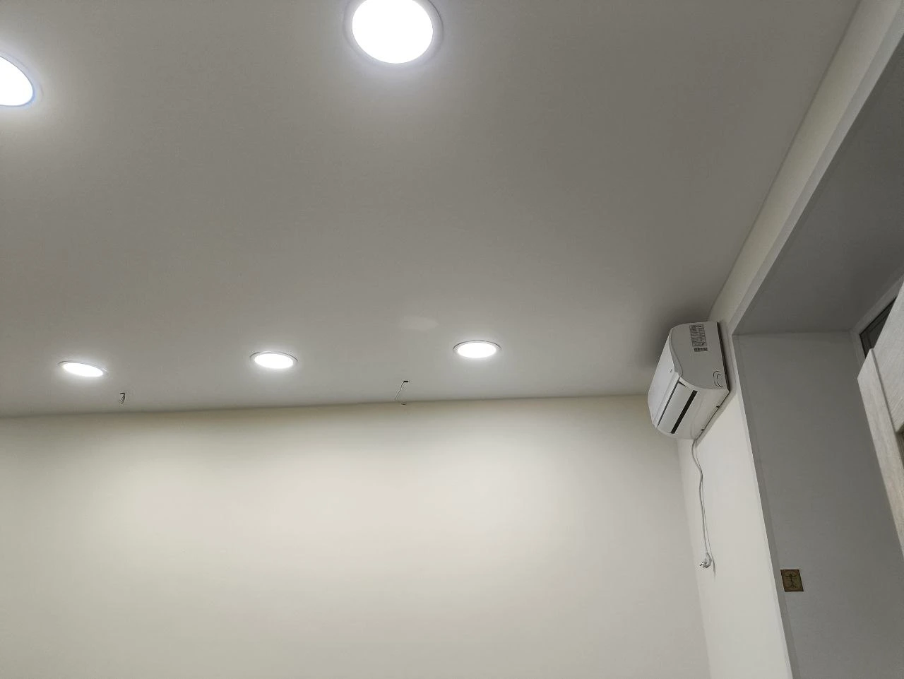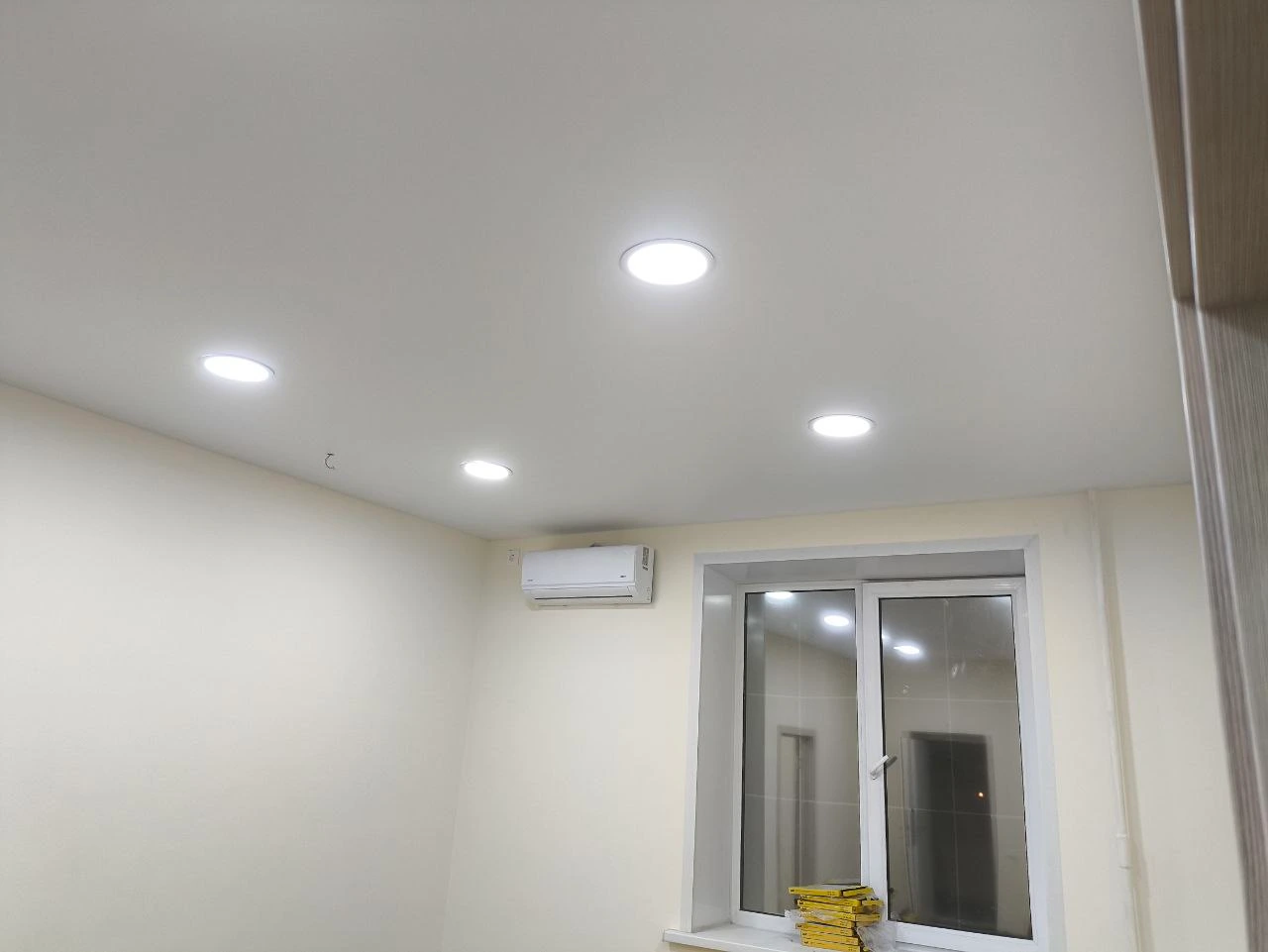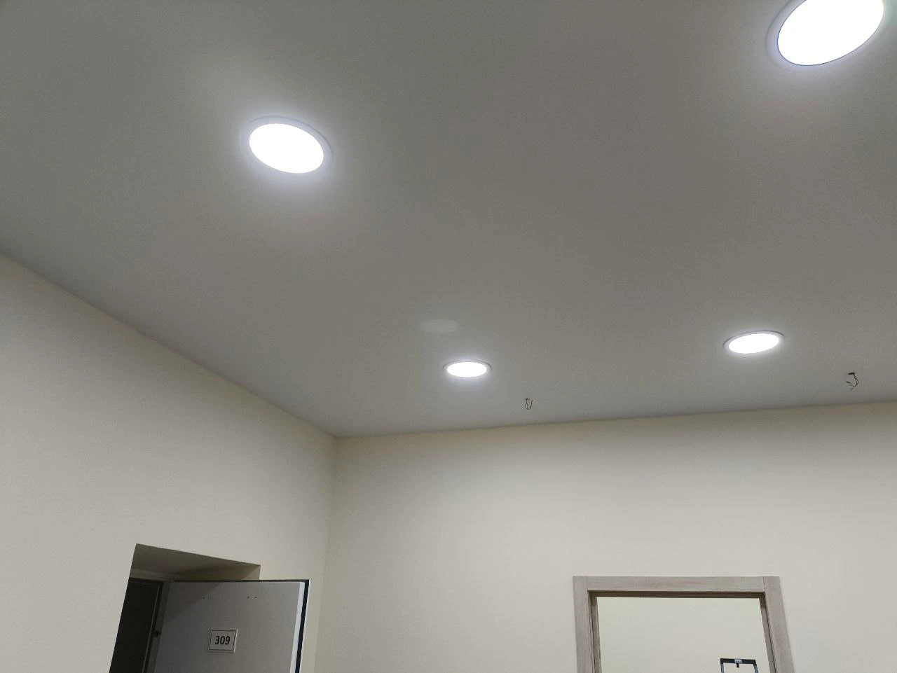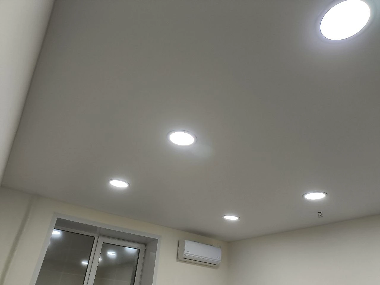 Стандартные офисные высокие потолки, 4 помещения по 8 больших светильников на комнату. Общая стоимость составила 64000 рублей.
