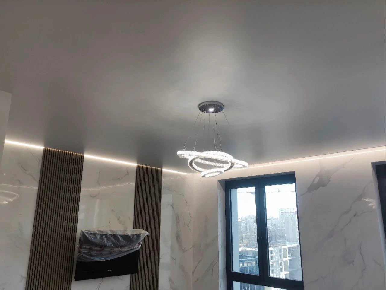 Глянцевое полотно отражает до 90% — это почти зеркальный эффект. Вы увидите отражение мебели, светильников и окон. Это визуально удваивает высоту потолка и добавляет пространства комнате.