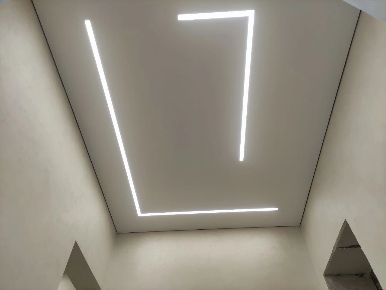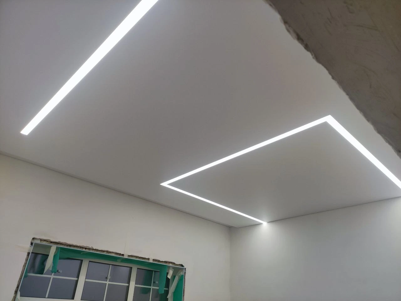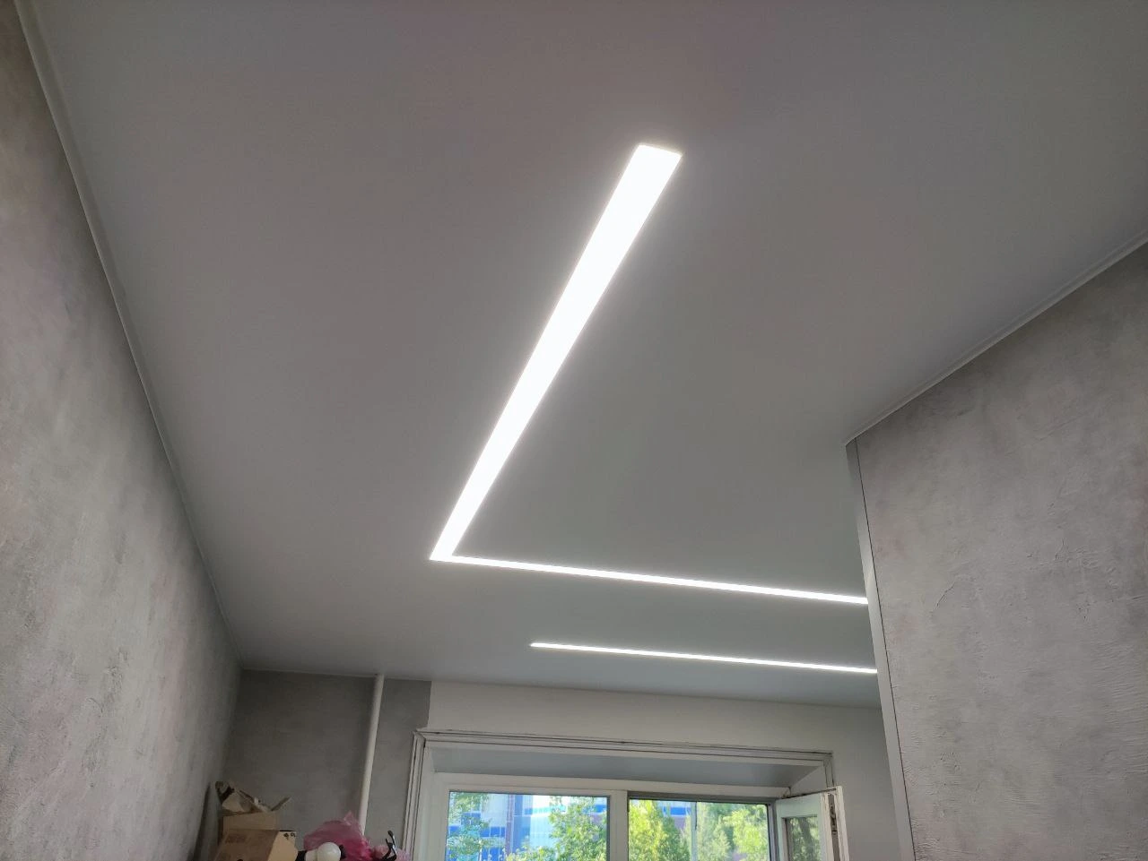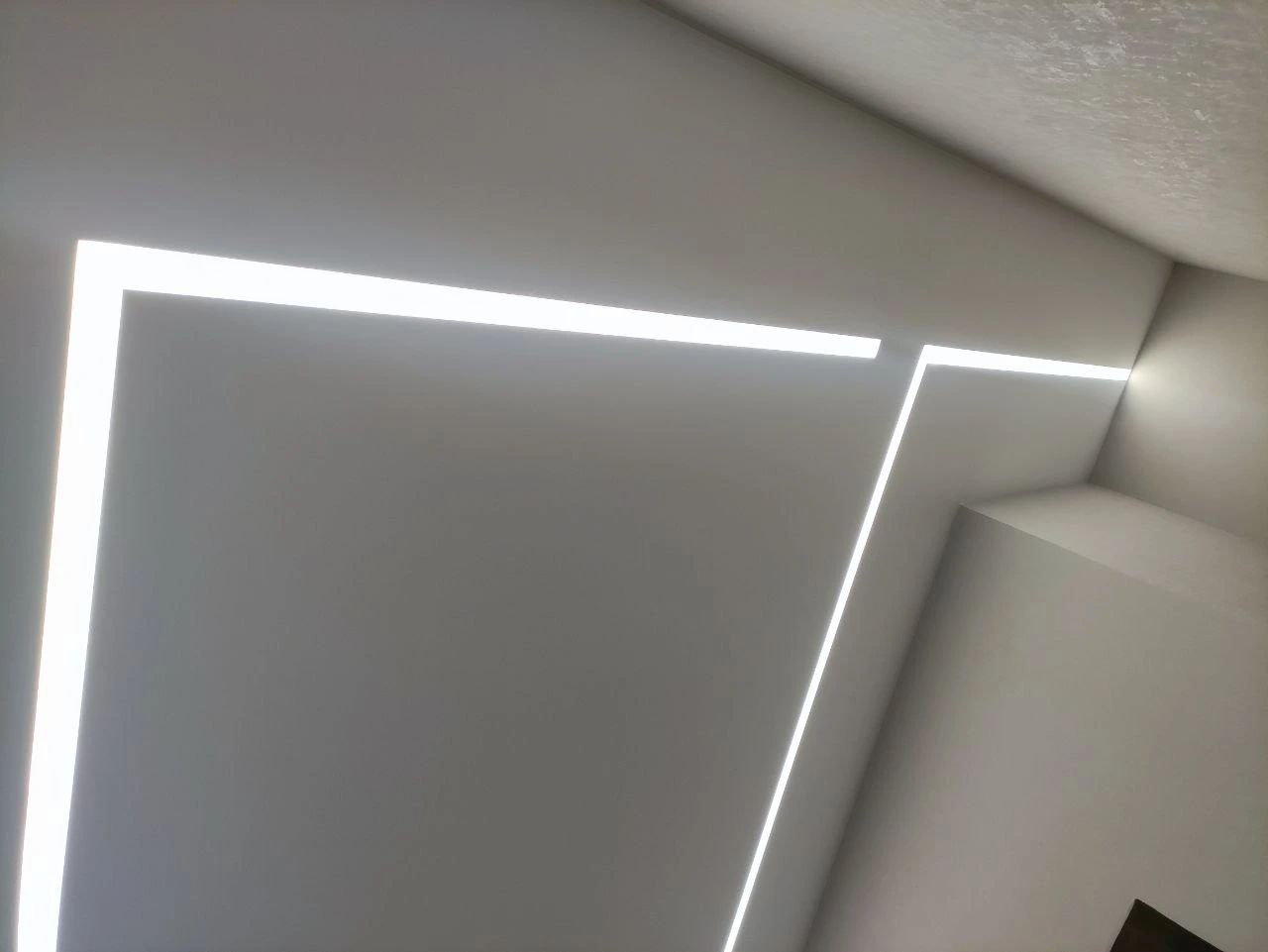 Световые линии — это встроенные LED-профили любой формы прямо в натяжной потолок. Прямые, ломаные, геометрические фигуры — создайте уникальный световой дизайн. Могут быть основным или дополнительным освещением.