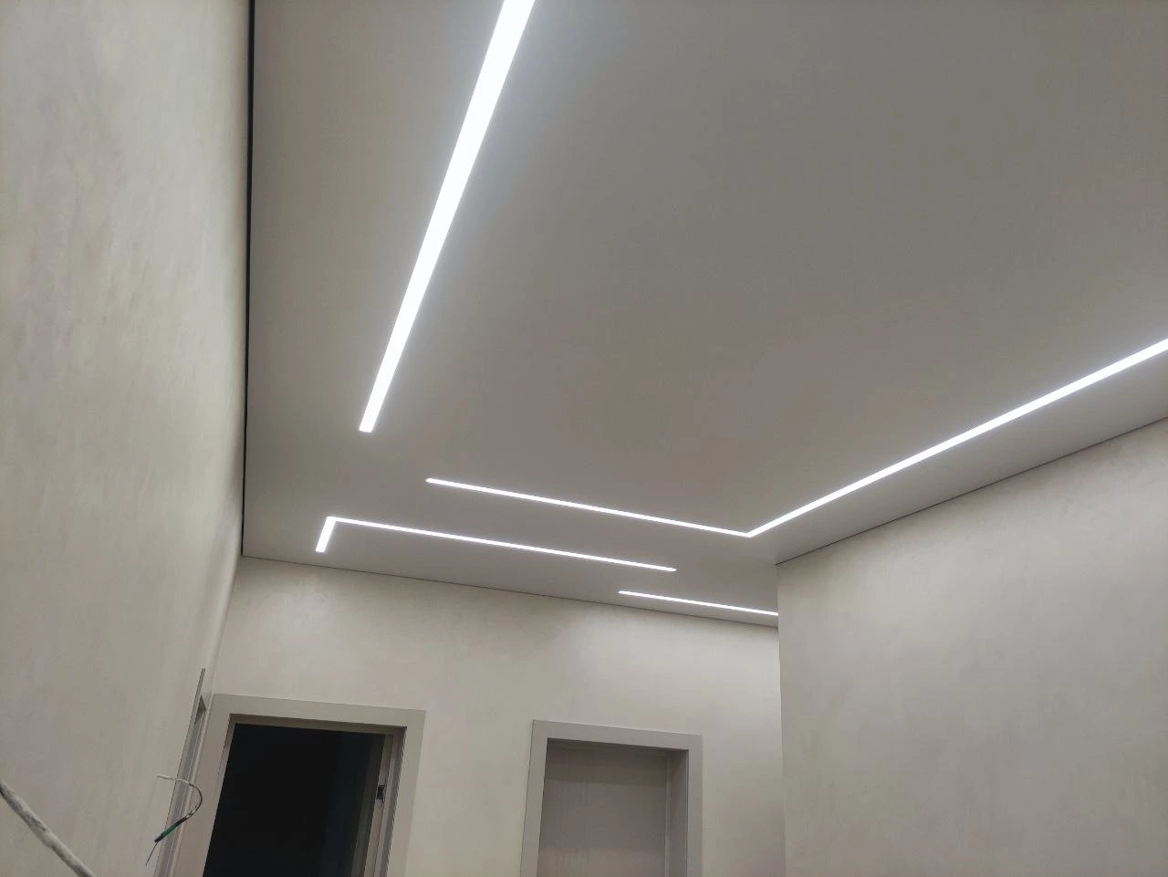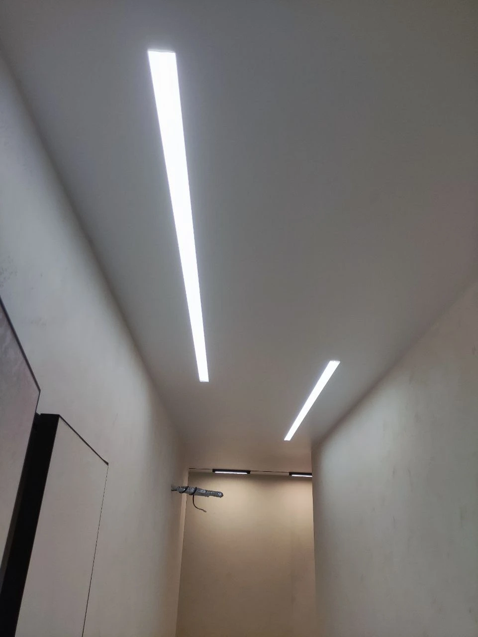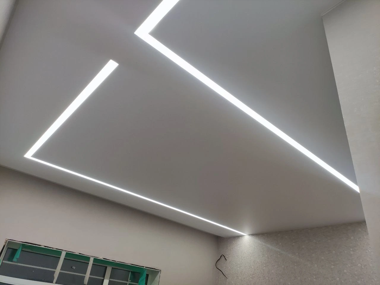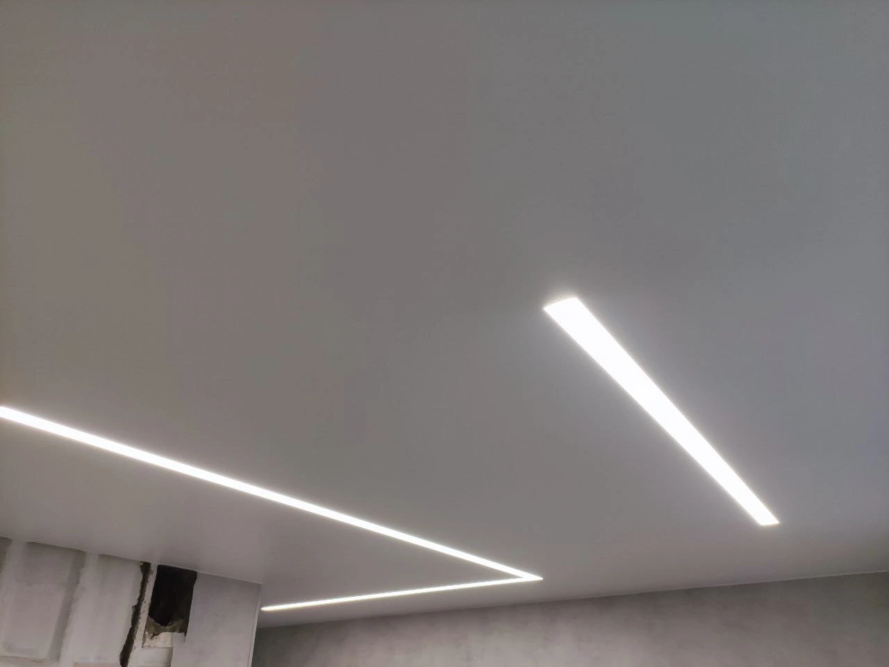 Световые линии — это встроенные LED-профили любой формы прямо в натяжной потолок. Прямые, ломаные, геометрические фигуры — создайте уникальный световой дизайн. Могут быть основным или дополнительным освещением.