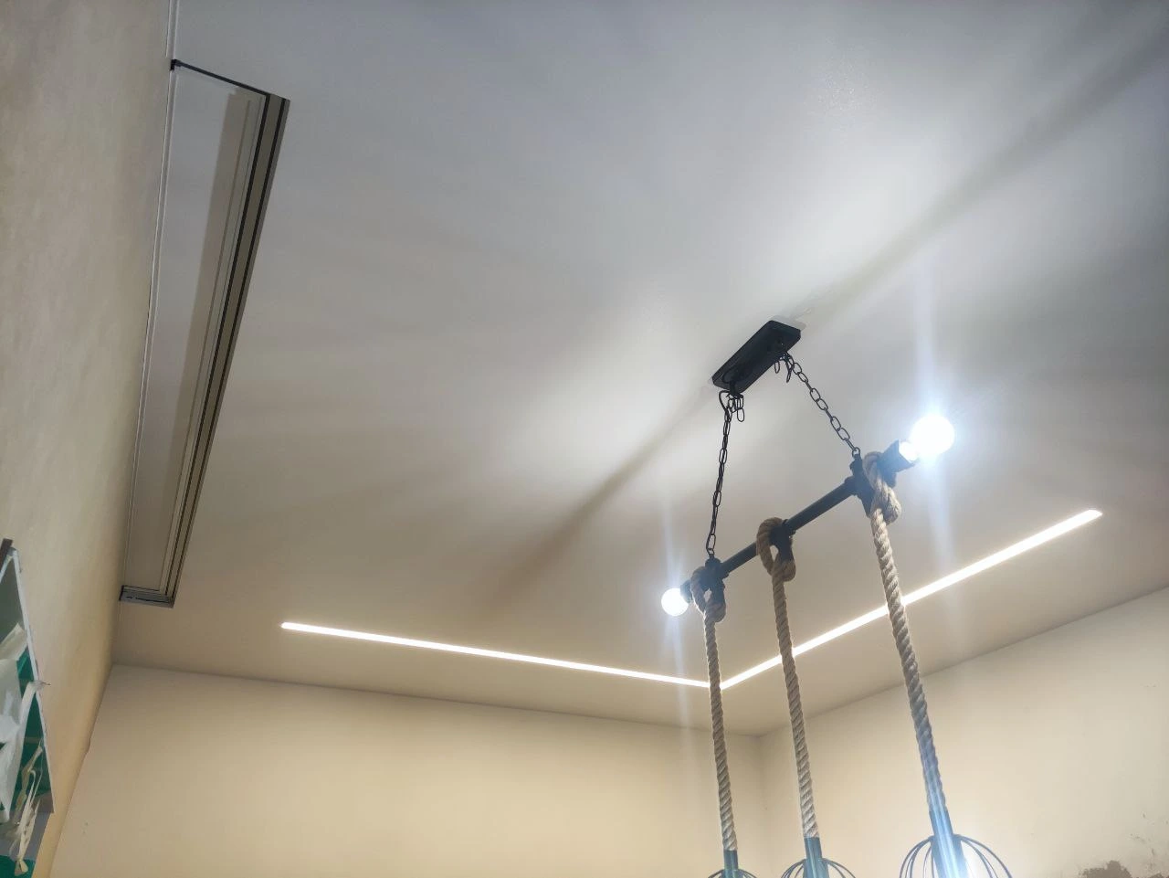 Световые линии — это LED-профили, встроенные в натяжной потолок и закрытые полупрозрачным полотном. При включении они дают ровный рассеянный свет. Линии могут быть прямыми, ломаными, образовывать геометрические фигуры или следовать контурам мебели.