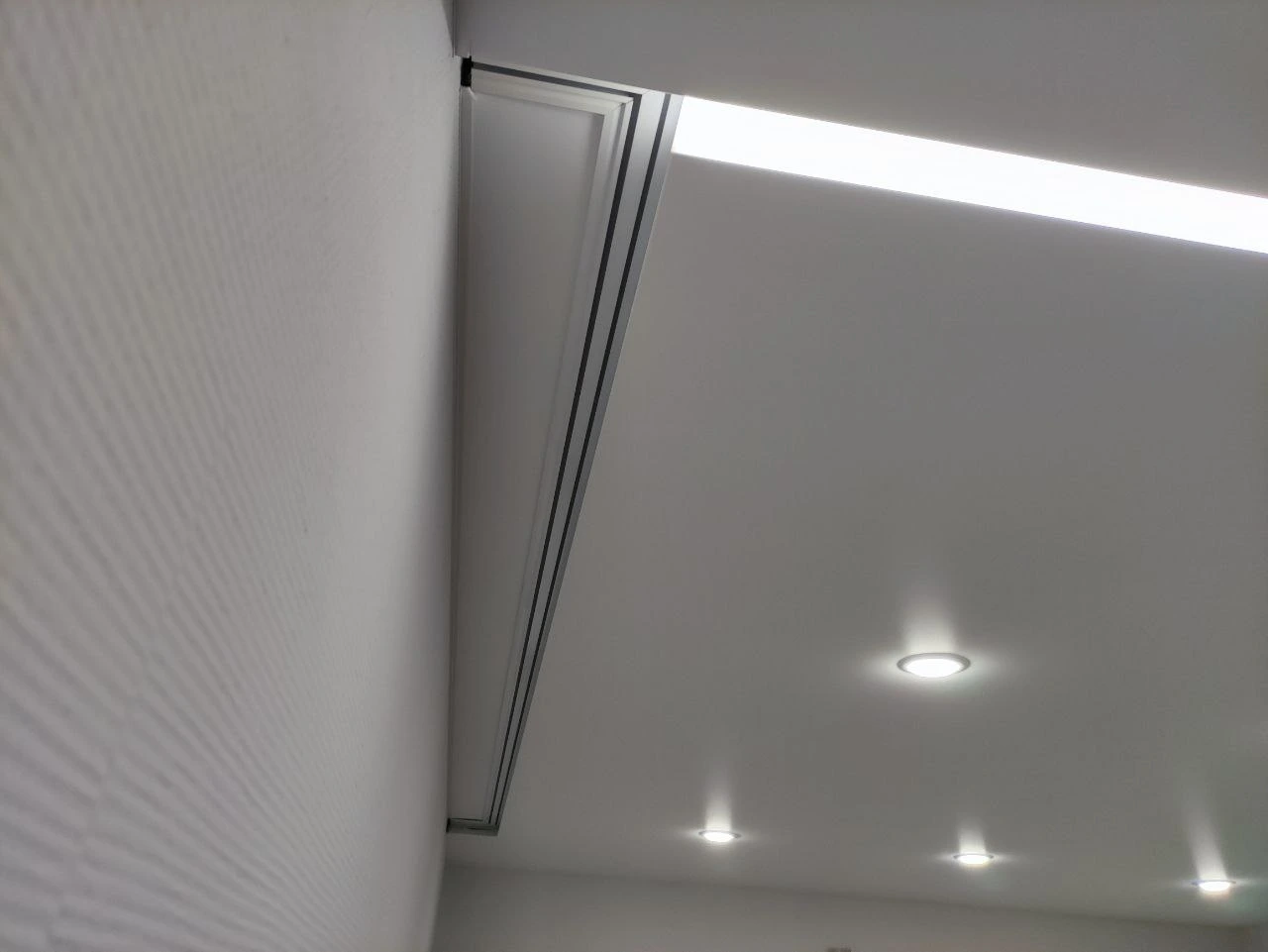 Стоимость световых линий на натяжном потолке — от 3700 рублей за погонный метр. В цену входит LED-профиль, светодиодная лента, рассеивающее полотно и монтаж. Сложные фигуры рассчитываются индивидуально.