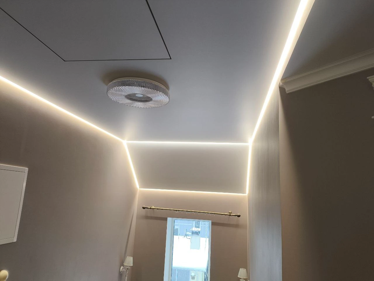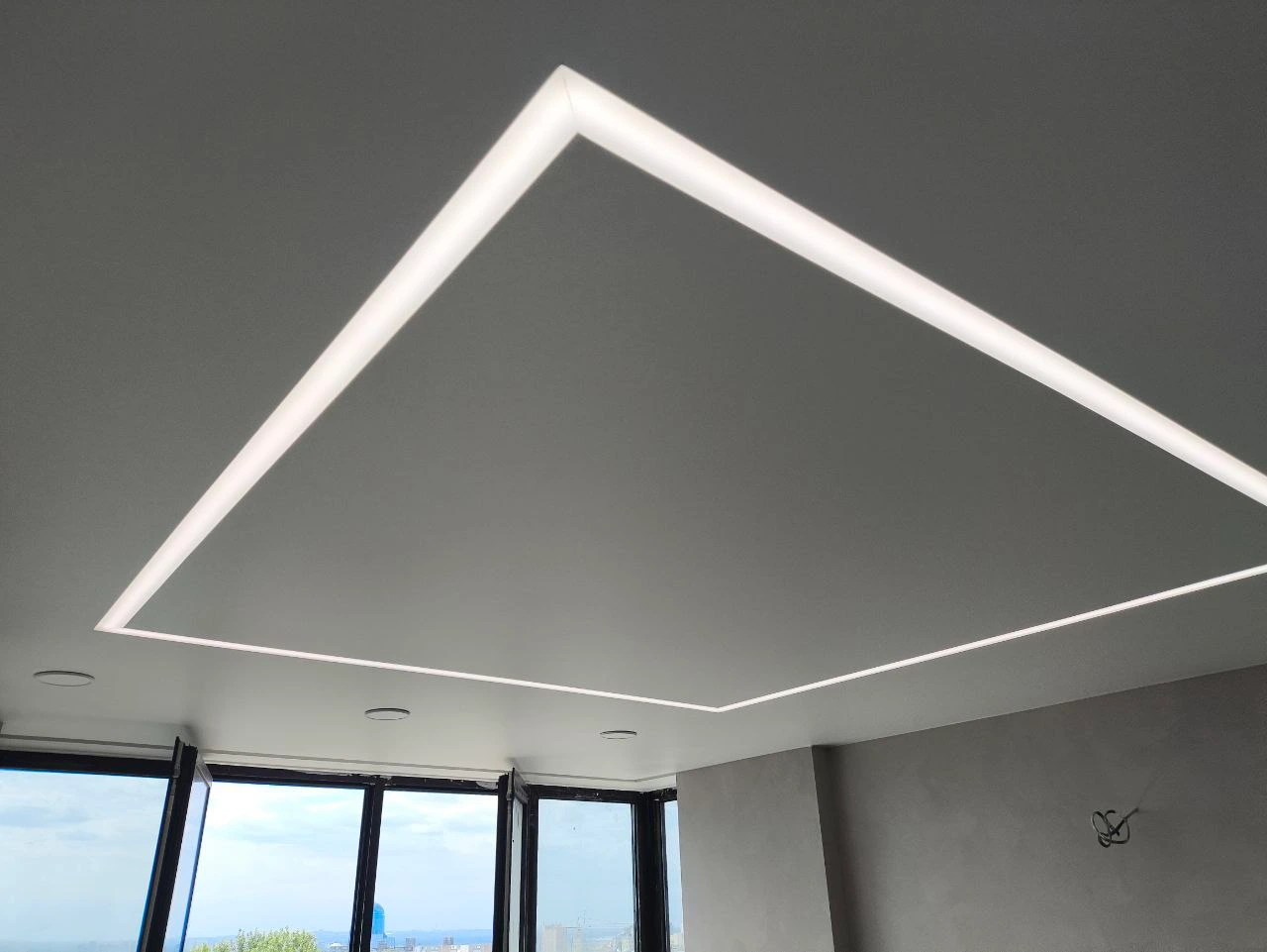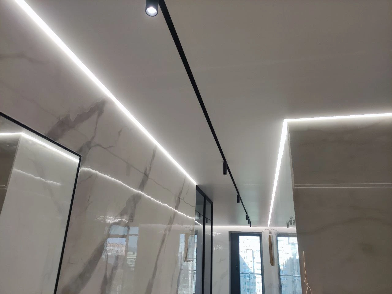 Премиальные натяжные потолки с качественными профилями. Световые линии и трековое освещение. Монтаж от одного дня.