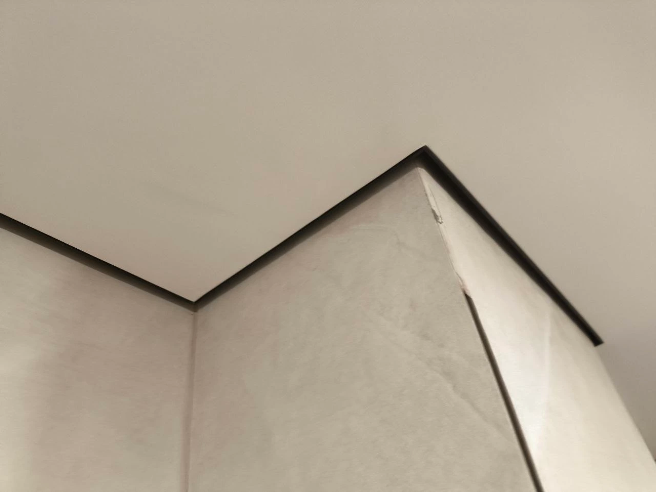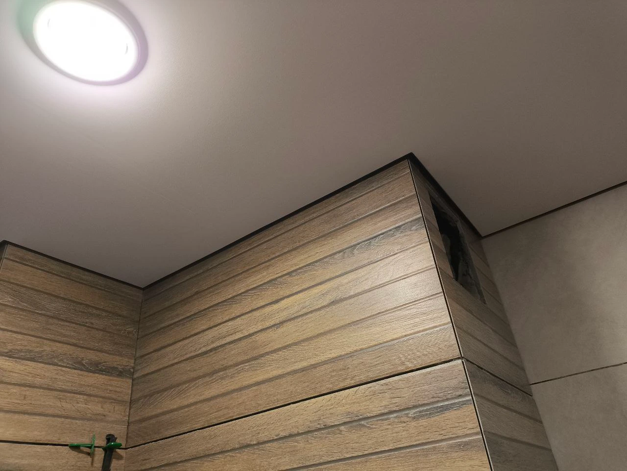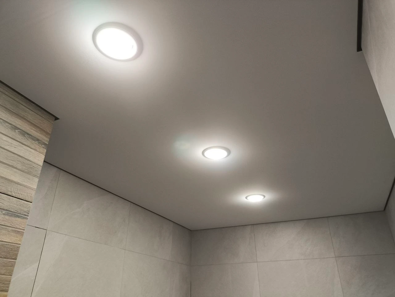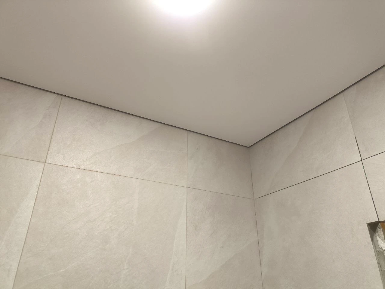 Не тривиальная задача - закатать санузел тканевым полотном. Для натяжки выбрано полотно Descor белого цвета. По стенам теневой профиль euroslott, который подчеркивает сложную геометрию стен санузла. По свету выбраны точечные светильники.