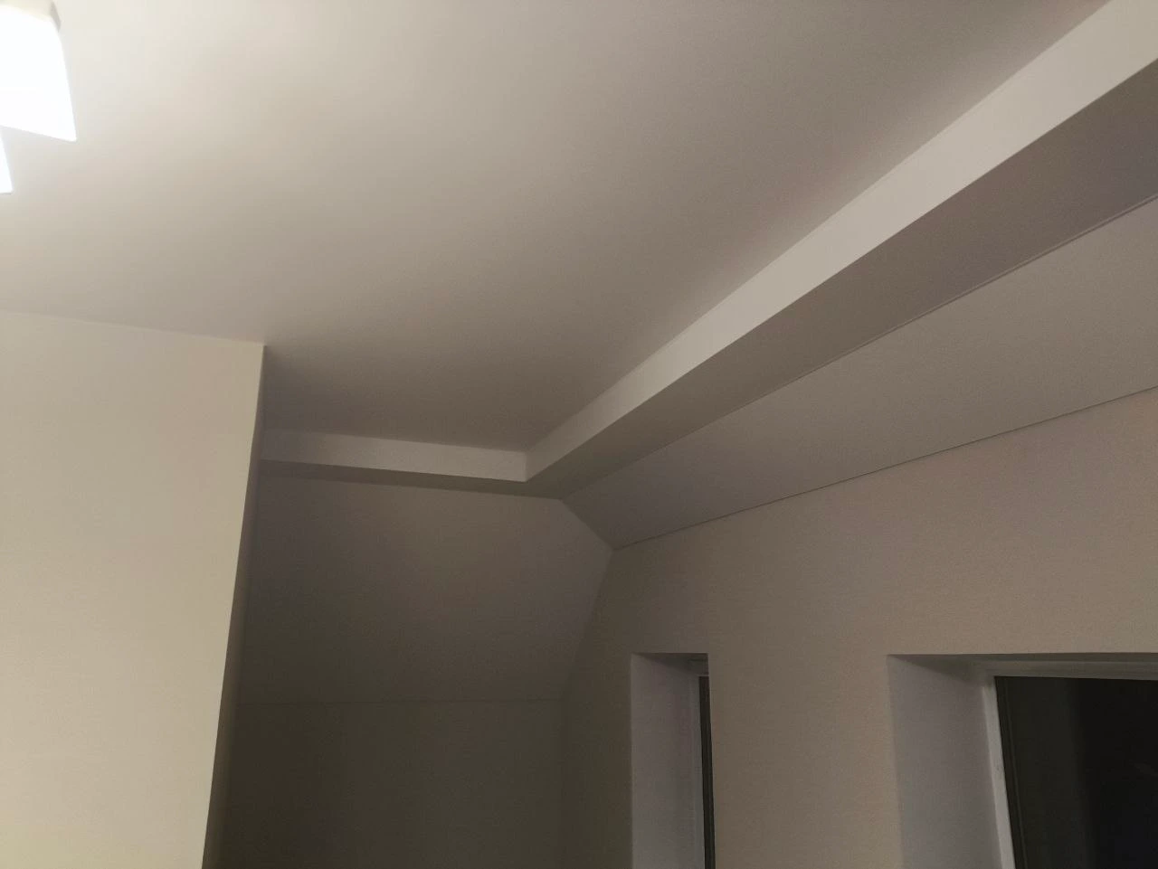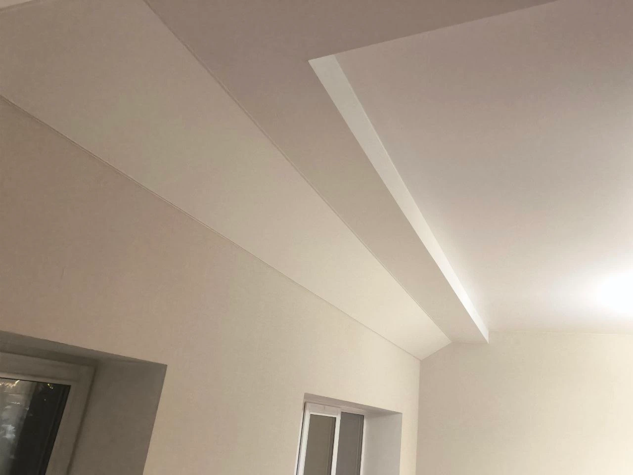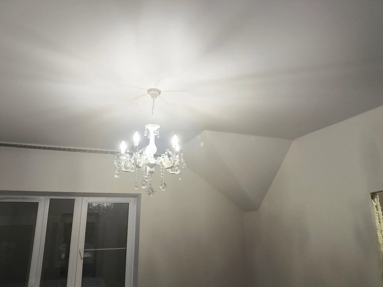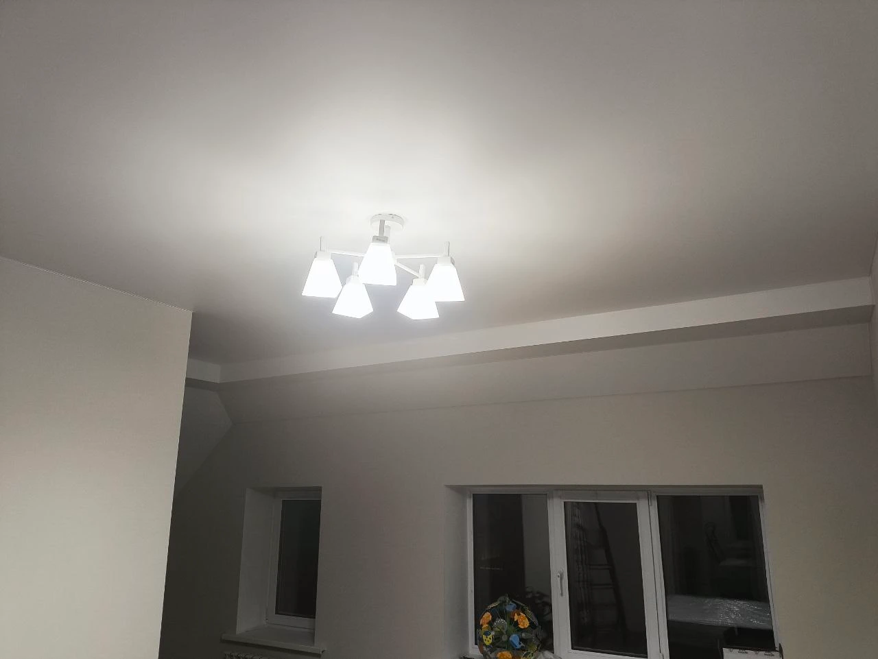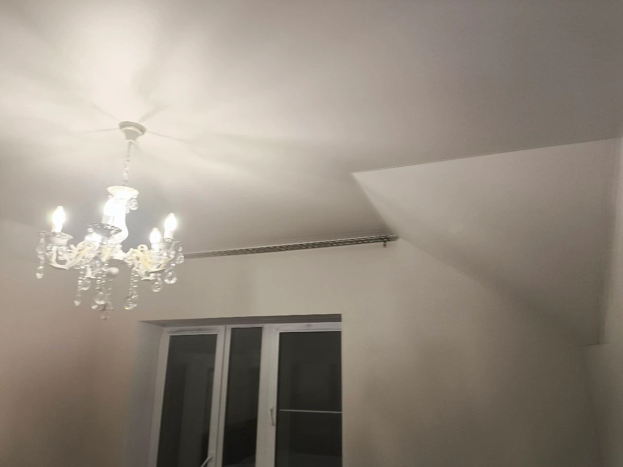 Интересный объект с переделкой потолков. Задачей было демонтировать старые полотна и сделать обход потолками всех элементов мансарды. В качестве основного света выбраны люстры. В гардеробной смонтирован ревизионный люк. Общая стоимость за 6 помещений составила 163000 рублей.