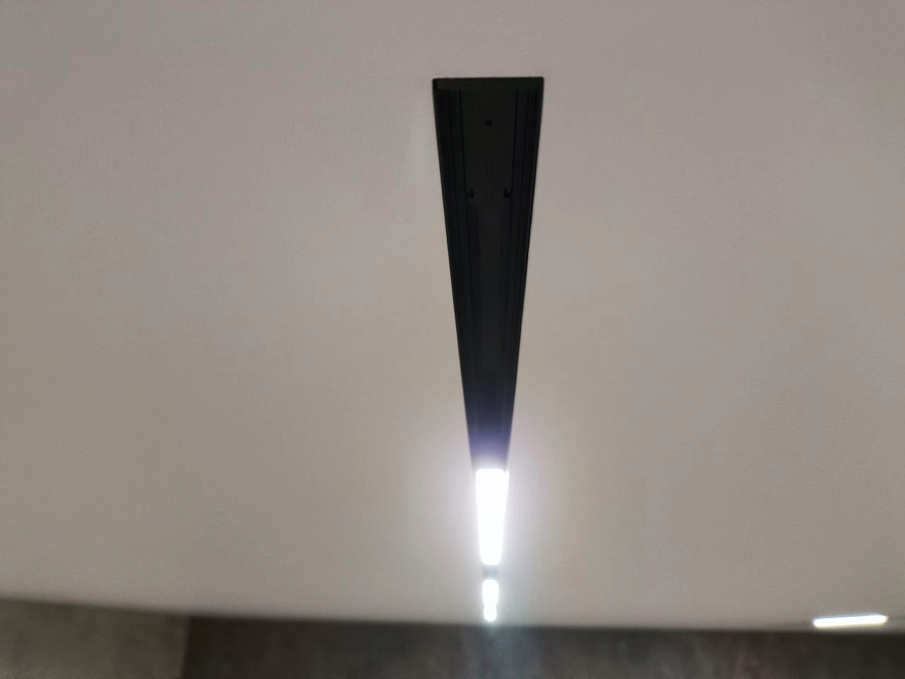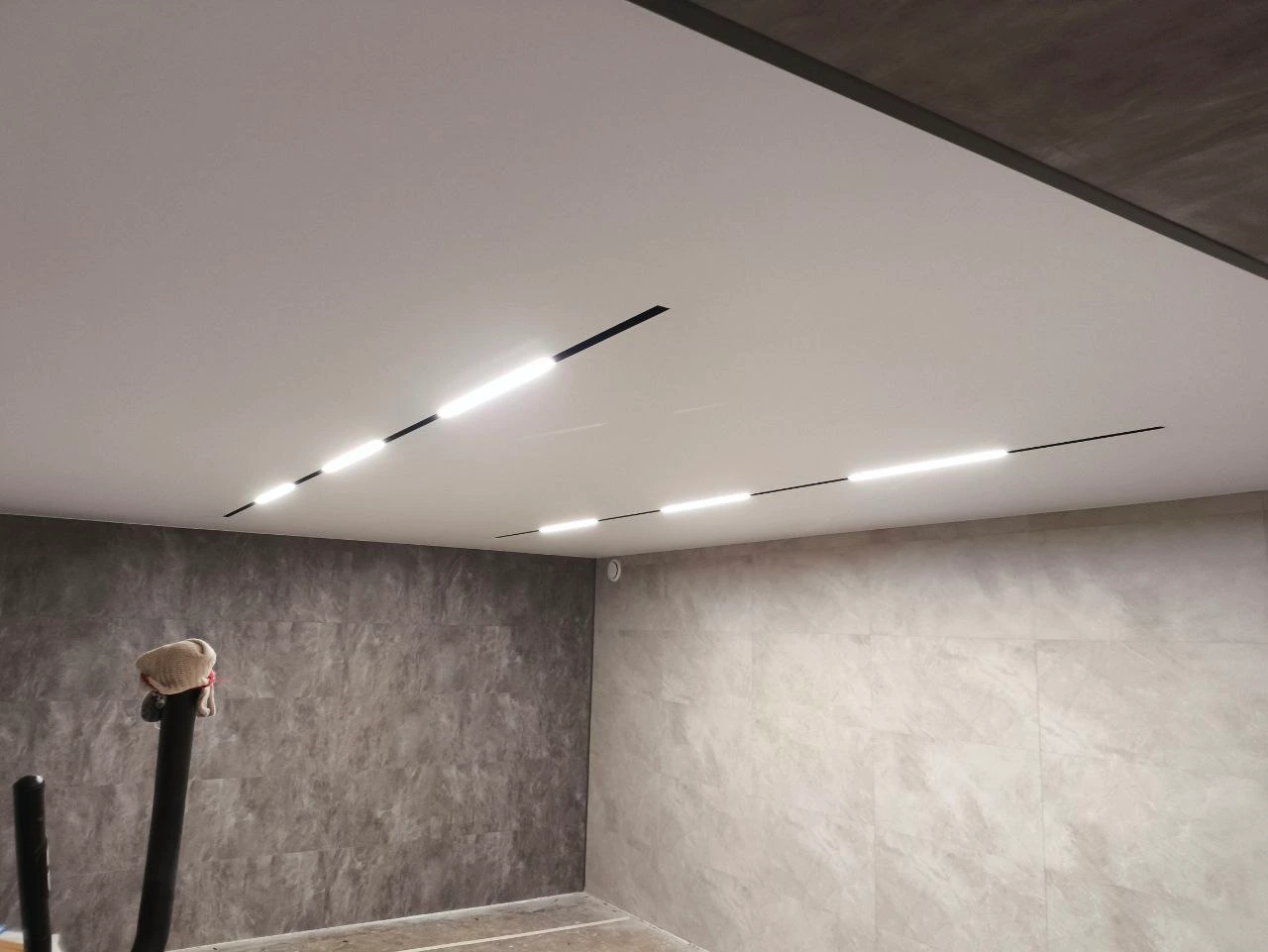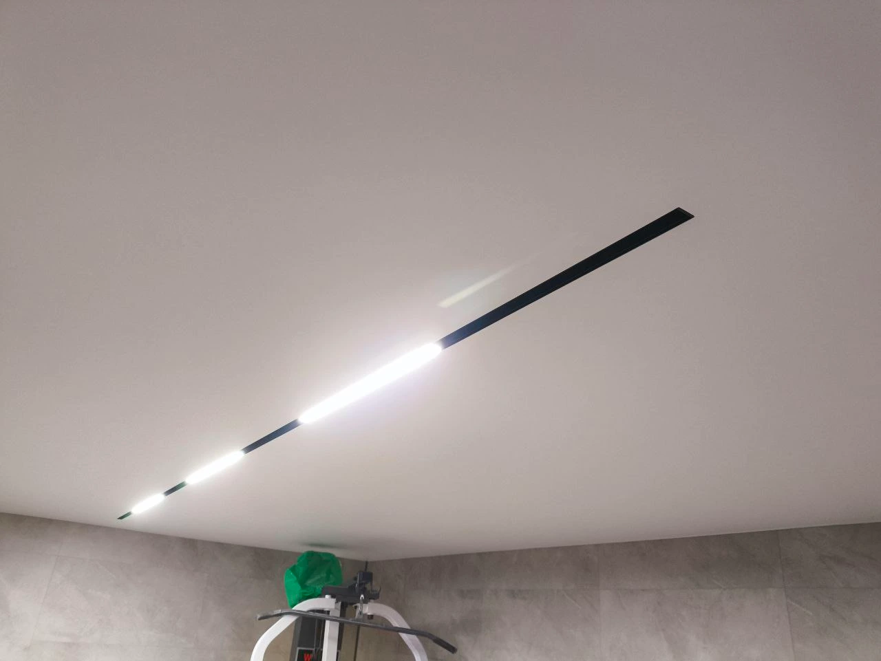 Белое матовое полотностеновой профиль со вставкоймагнитная трековая системаумные светильники с регулировкой температуры света