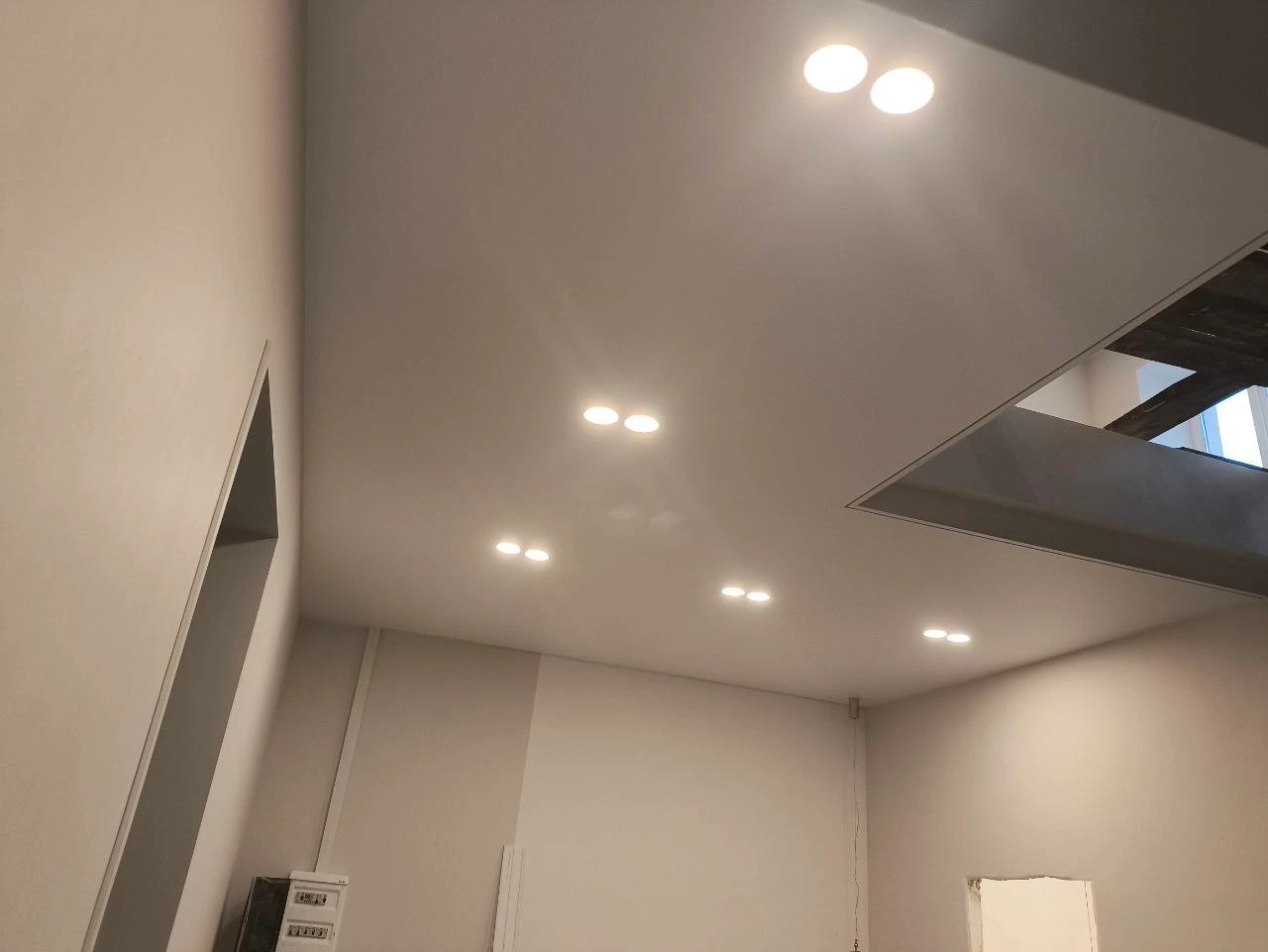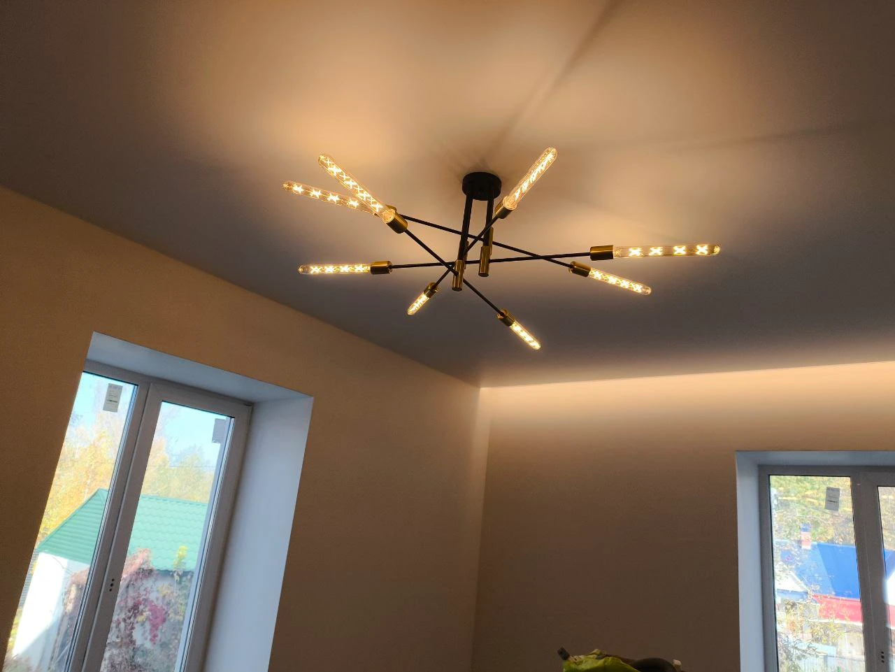 Затяжной массивный объект, на котором мы зависли практически на месяц. В доме проект по потолкам включает в себя монтаж светильников BH53 - 122 штуки, парящий профиль с теплой подсветкой и с музыкальной RGB подсветкой, обход лестничного пролета профилем flexy brus 06 белого цвета, световые линии общей длиной 11 метров с теплым светом, монтаж теневых диффузоров и вентиляторов с теневым зазором, монтаж кронштейнов собственной разработки для подвесных кресел, переоборудование вентиляции, монтаж скрытых карнизов ПК15 сложной формы под эркер с подсветкой. Профиль по стенам преимущественно обычный со вставкой.