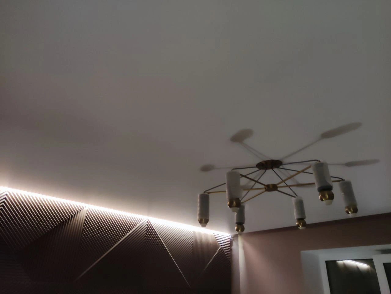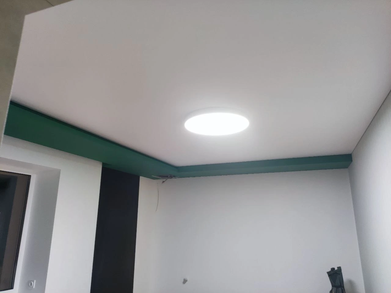 Интересный объект, клиенту было необходимо разделить предмонтаж и монтаж, чтобы подготовить покраску стен. Были смонтированы потолки в двух комнатах, в прихожей, в двух санузлах, в кухне-гостиной и на балконе. В кухне-гостиной был смонтирован теневой профиль, eurokraab, для освещения были смонтированы световая линия flexy line 30, люстра простая и люстра с 6 точками подвеса к потолку. На балконе периметр был выполнен на парящем профиле с мощной лентой для основного света. В прихожей был установлен магнитный трек длиной 2 метра и светильник. В санузлах по керамограниту был смонтирован теневой профиль eurokraab, а также парящий профиль с мягкой подсветкой. В детской комнате периметр был выполнен обычном теневом профиле, для света выбрана одна люстра. В спальне задачей было подсветить декоративные панели у прикроватной стены. Для гардины нужно было сделать торцевание до базового потолка. Общий срок монтажа включает время, потраченное на монтаж и предмонтаж.