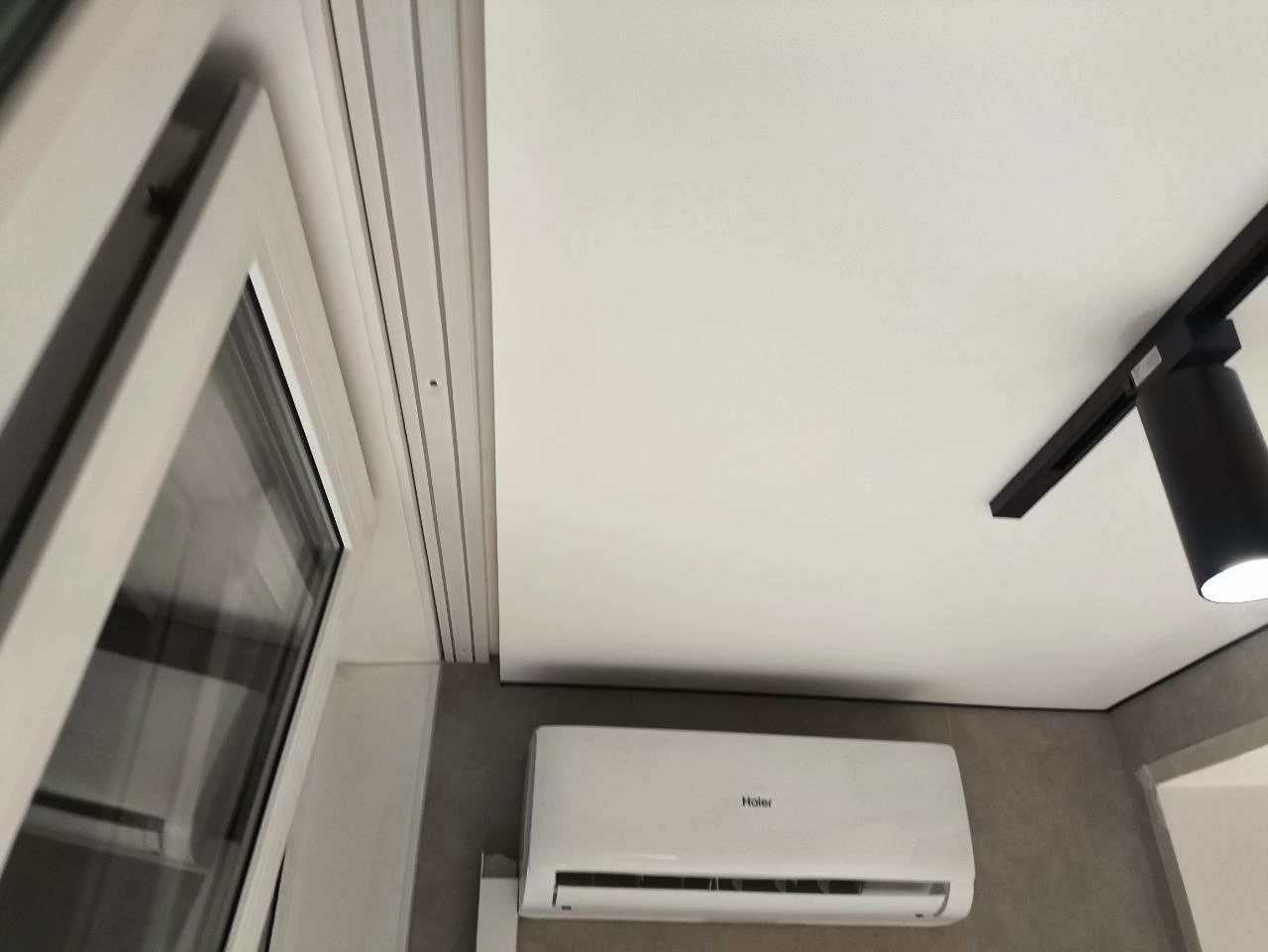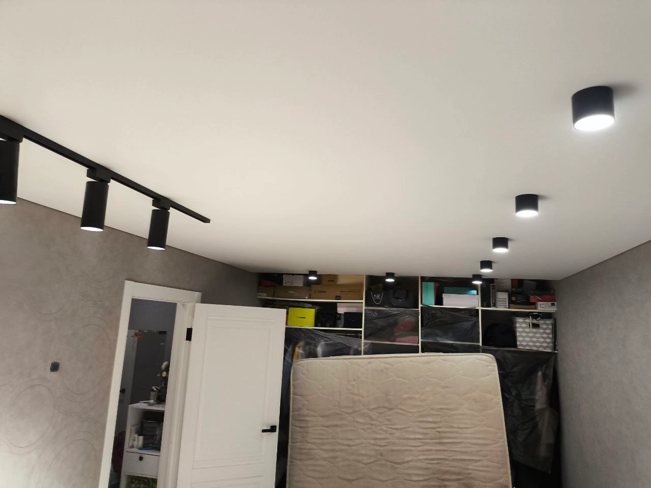 Примыкание потолка к стенам выполнили с помощью пластикового теневого профиля. С одной стороны комнаты будет шкаф-купе, поэтому теневой профиль нашит на закладной брус для направляющей шины. Между помещениями сделана реечная перегородка, её была задача обойти парящим профилем с подсветкой. Для основного освещения выбраны треки и споты. Итоговая стоимость составила 50000 рублей.