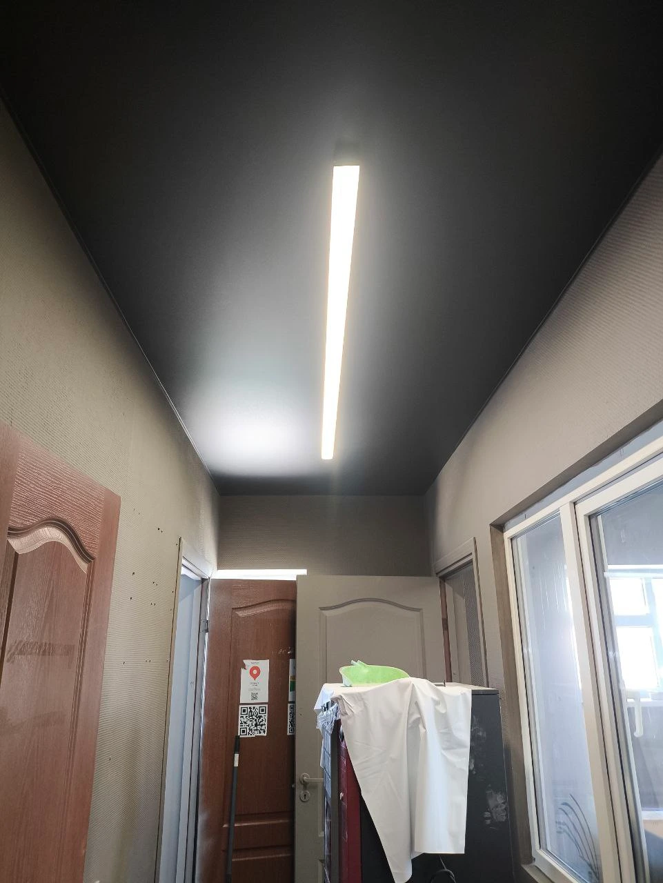 Произвели монтаж потолков в административной части детейлинг центра, то есть в комнате отдыха, коридоре, санузле и кабинете. В комнате отдыха смонтировали квадратную нишу из черного профиля flexy brus 03, основным источником света были выбраны накладные световые линии flexy svet 50. Чтобы был доступ ко всем коммуникациям был смонтирован встроенный люк 40*40 см. В коридоре для освещения также была использована накладная световая линия flexy svet 50. Общая стоимость составила 96000 рублей.
